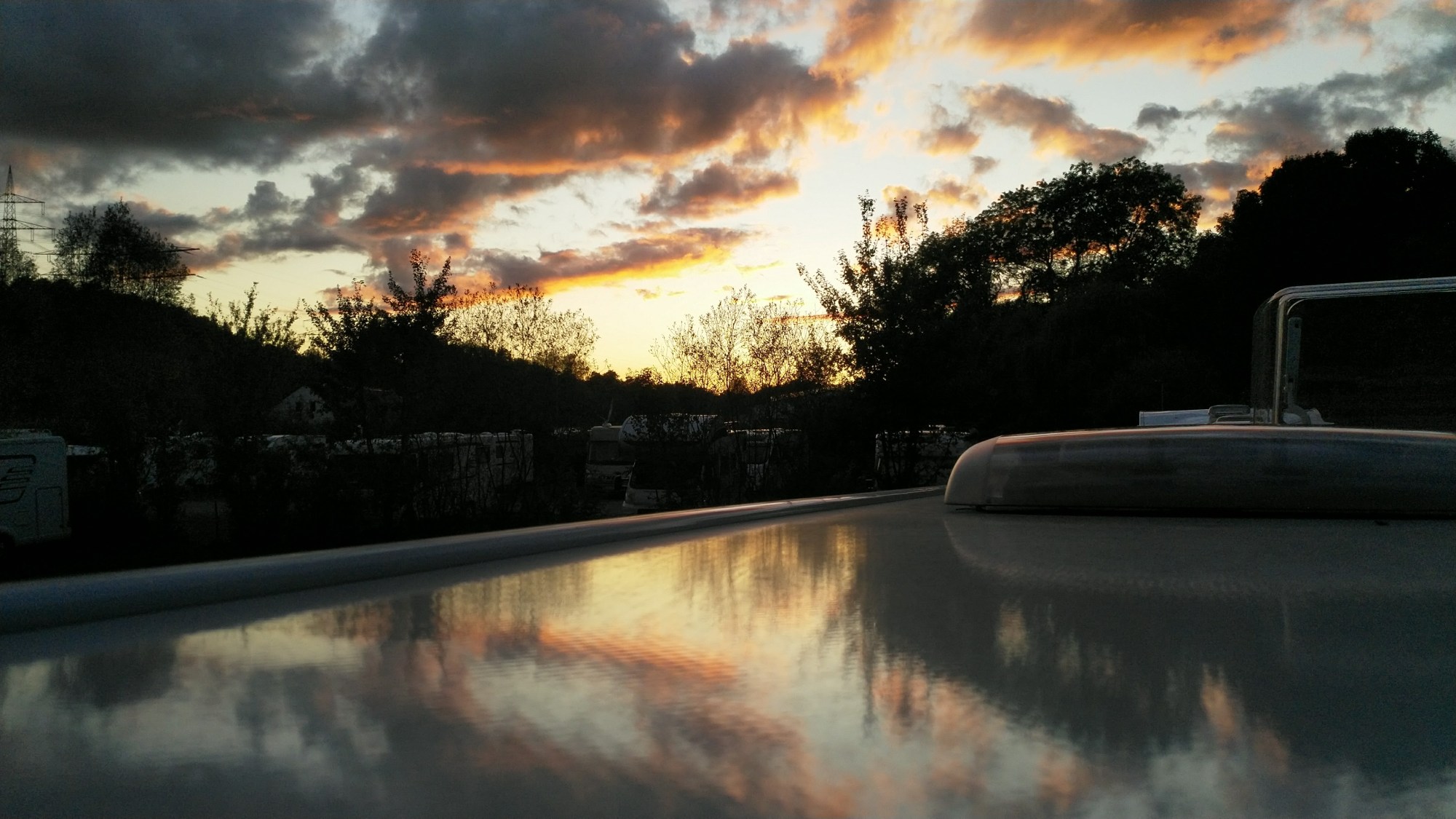 Tag der Deutschen Einheit – Gemütlich fuhren wir von Illertissen nach Stockach zurück. Am Morgen regnete es immer noch (auch durch die ganze Nacht) in Strömen, der sich jedoch kurz vor Stockach verzog. So konnten wir unsere Koffer und Kisten zum Glück bei strahlendem Sonnenschein packen und den Yaris beladen. Auch für eine erste und gründliche Reinigung reichte die Zeit, da wir bei der morgigen Abgabe nicht in Zeitnot kommen wollten. Danach haben wir einen Spaziergang über das Areal der zu verkaufenden Wohnmobile & Wohnanhänger gemacht und das schöne Wetter genossen. Der Campingplatz neben der McRent Station hatte noch einige Stellplätze mit Strom frei, wo wir unsere letzte Nacht verbrachten. Der anstrengende Tag belohnte uns mit einem wunderschönen Sonnenuntergang.