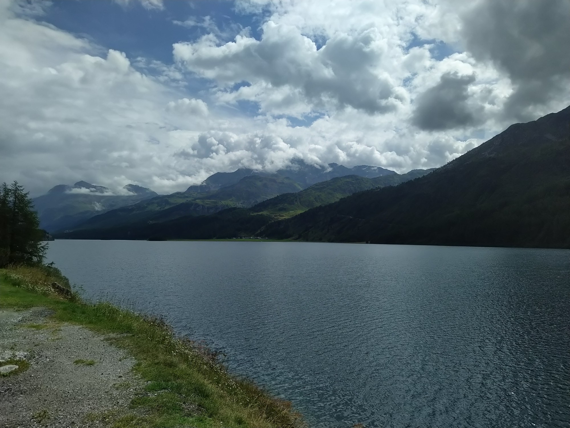 Nach einem guten Frühstück machen wir uns auf den Weg zu den drei Seen (St. Moritzersee / Silvaplanersee / Silsersee). Kurz nach Pontresina stehen wir ca. 15 Minuten im Stau. Offenbar sind wir in eine Baustelle geraten, wo ein neuer Kreisverkehr gebaut wird. Gestoppt werden die Verkehrsteilnehmer von drei Seiten. Dabei hat unsere Seite das nachsehen, da bei unserer Schlange jeweils max. 15 Autos fahren dürfen.