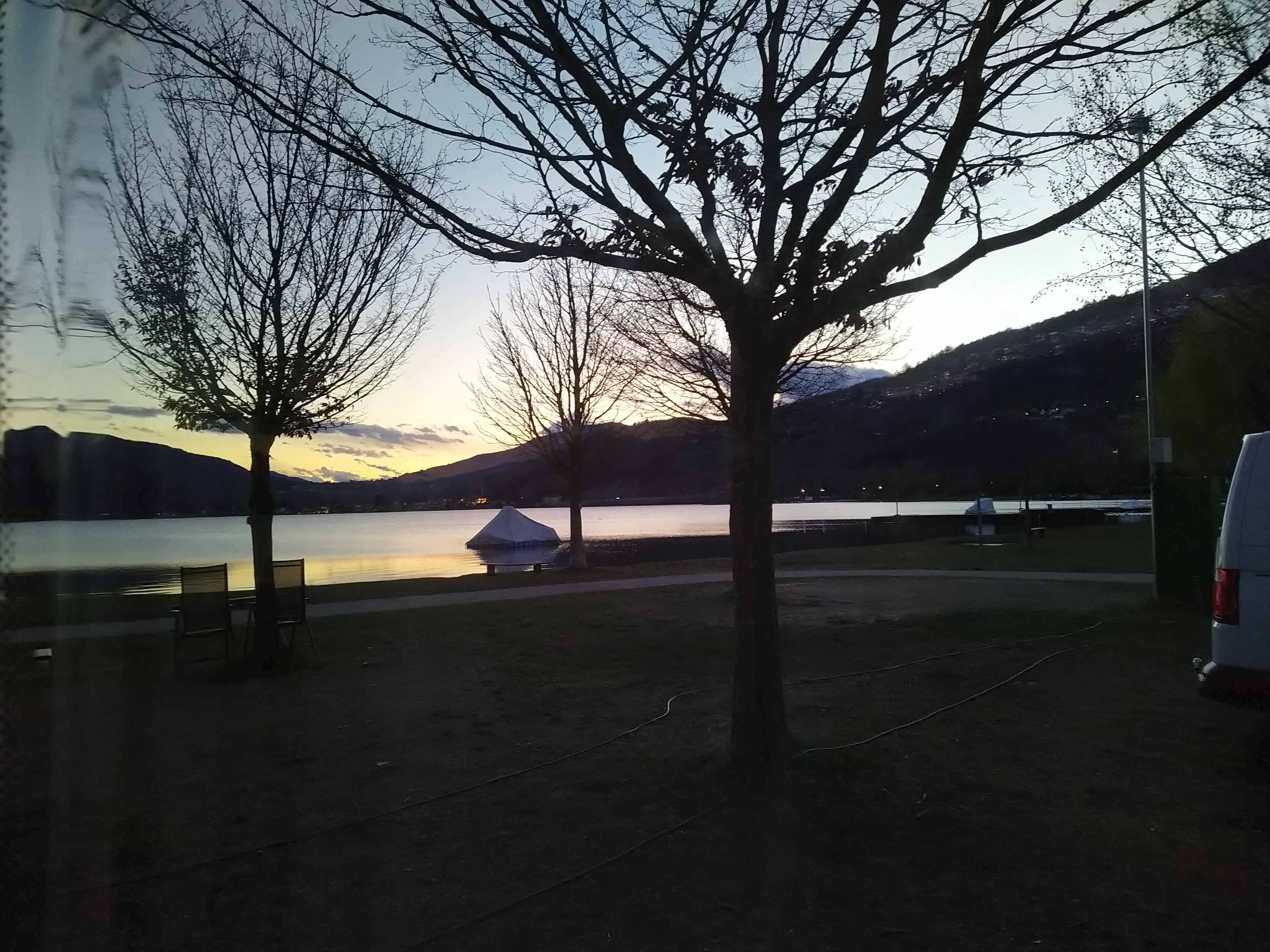 Nach dem Tunnel kam uns die Landschaft wie eine andere Welt vor. Der Himmel war blau, die Sonne schien und es hatte kaum Wolken am Himmel. Die ganze Mühe und längere Fahrzeit hat sich direkt gelohnt. Beim Campingplatz angekommen, durften wir direkt unsere Parzelle beziehen. Wir stehen in der zweiten Reihe direkt am See. Als wir den Anhänger platziert hatten (vielen Dank an unseren Mover), entschlossen wir uns, das Vorzelt auch noch aufzubauen. Nach ca. 45 Minuten waren wir fertig und konnten die wunderschöne Aussicht geniesssen. Wir freuen uns auf die nächsten Tage hier.