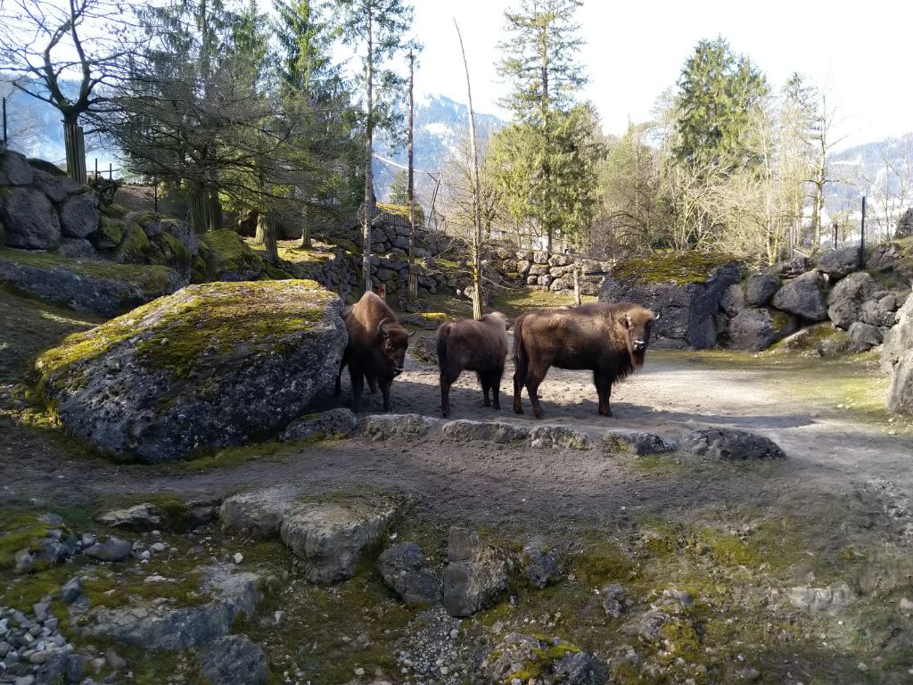 Heute ging es in den Natur- und Tierpark Goldau. Dank des modernen Zeitalters konnte man bereits am Vortag sein Ticket online kaufen, da die Besucheranzahl limitiert ist im Park. Wir waren kurz nach neun auf dem Parkplatz und zogen gutes Schuhwerk an. Kurzer halt beim Scanner an der Kasse und wir durften eintreten. Begrüsst wurden wir von einer Bison Familie und ein, zwei, drei Enten.