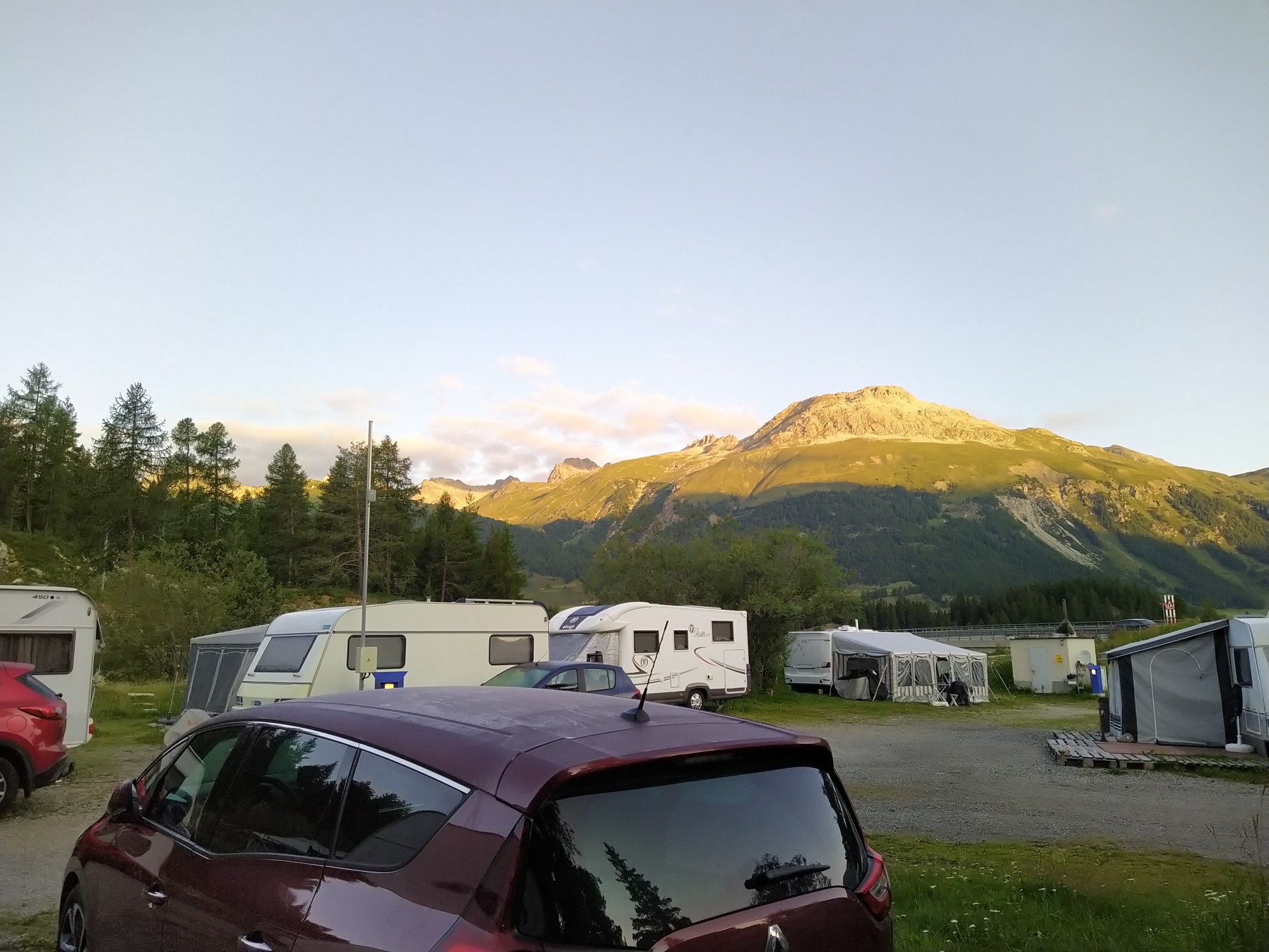 Es war nicht viel Verkehr, weshalb wir gut vorankamen. Auf dem Julier Pass waren wir oft alleine unterwegs. Kurz nach 11 Uhr kamen wir in Landquart an. Wir hatten Glück, da die Rezeption noch offen hatte. Fabian ging uns anmelden und bekam die Platzeinweisung vom (wie wir annehmen) Lehrling. Der junge Mann war sehr freundlich und hilfsbereit. Da wir ihn bei unserem letzten Besuch nicht gesehen haben, wusste er nicht, dass wir uns ein wenig auskennen. Sein Chef, welcher grinsend im Hintergrund stand, wusste dies jedoch :).