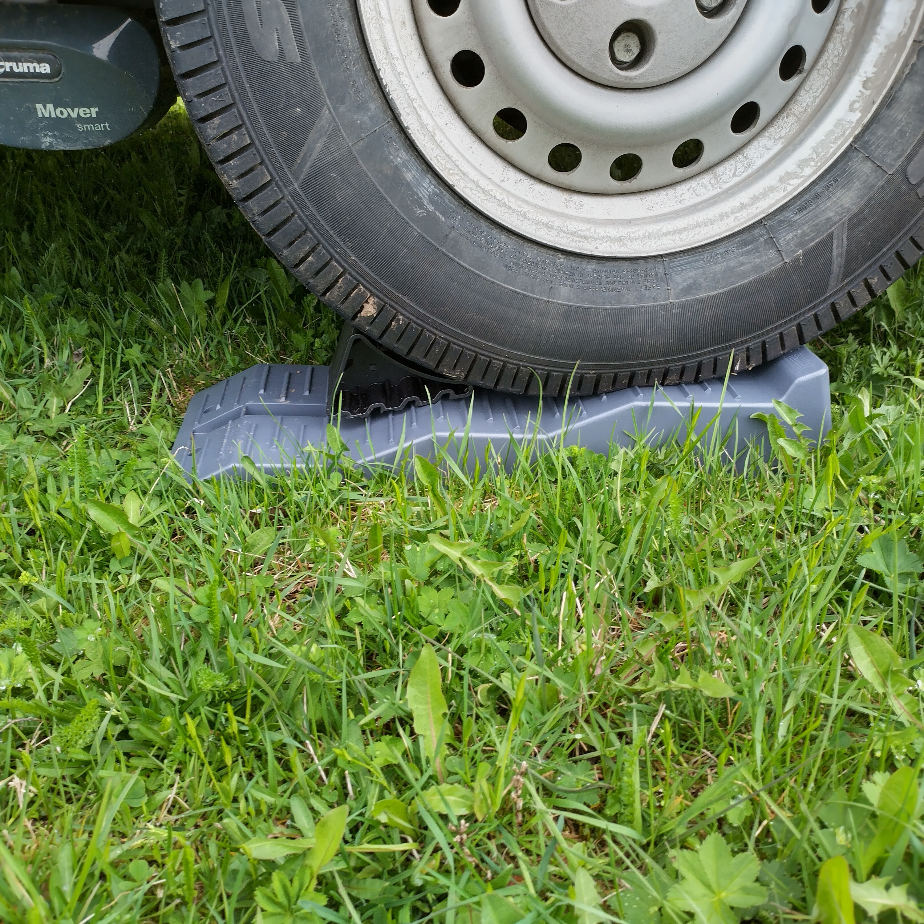 Da unser Nivelierungskeil bereits im Rasen versunken (und vermutlich schon ein Teil der hiesigen Hasen-Kolonie) war und wir daher auch im Wohnwagen bergauf gehen müssen, entschieden wir einen nahe gelegenen Caravanhändler aufzusuchen. Wir hofften, dass wir bessere Keile finden würden, welche „Terrassen-förmig“ aufgebaut war. Diese sind meistens auch etwas breiter.