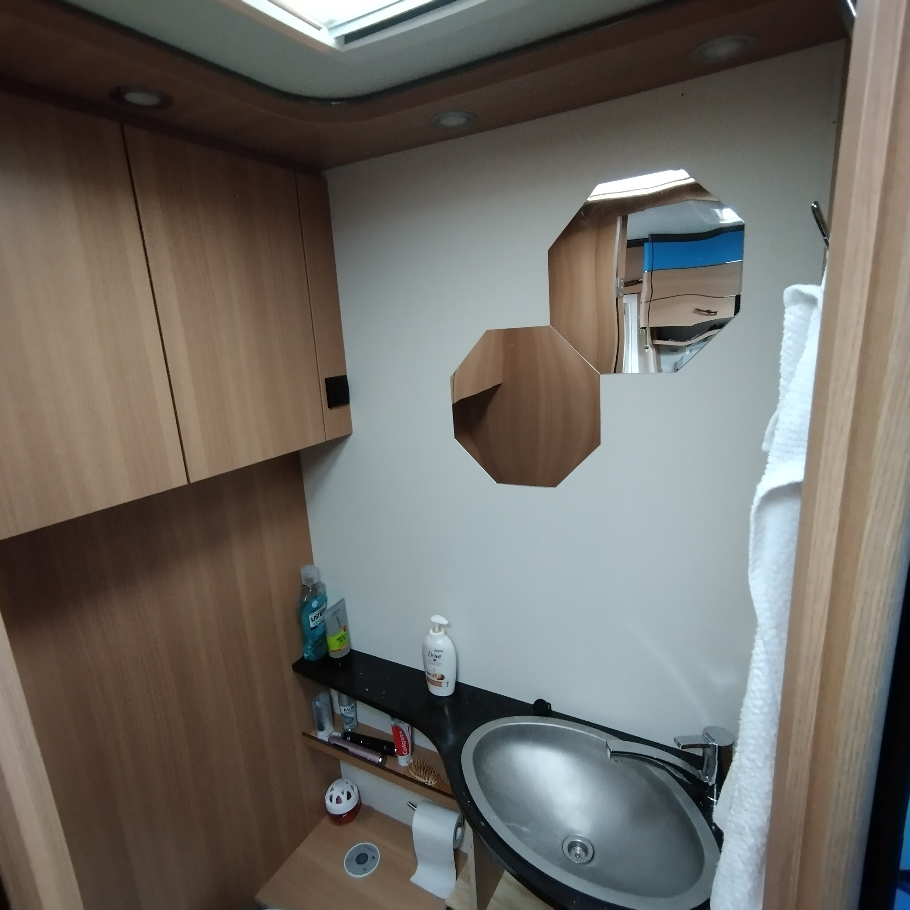Wieder beim Wohnwagen angekommen, schraubten wir den Spiegel im Badezimmer ab. Er war gross und wog sehr viel. Zudem reichte er von der Decke bis zum Waschtisch, weshalb er bei jedem Gebrauch verspritzte und mühselig zu reinigen war. Anschliessend montierten wir die zwei kleineren Spiegel, welche wir im 1$-Dollar Laden gefunden haben. Die klebende Rückseite haftete nicht genug, zum Glück haben wir eine Rolle Tesa-Klebeband gekauft, welches einwandfrei funktionierte.