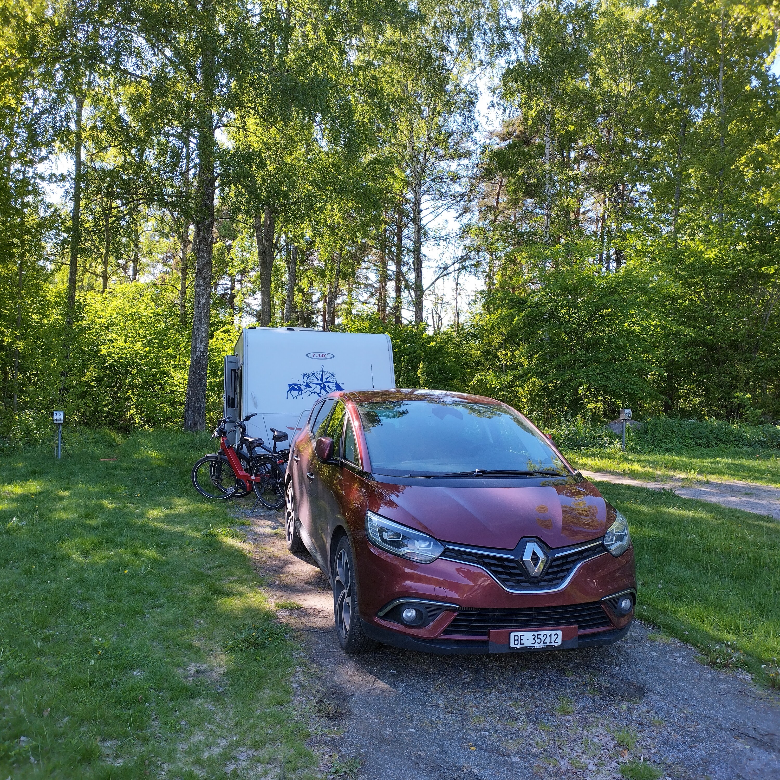 Unser gewählter Platz ist herrlich! Wir stehen unter ein paar Bäumen, weshalb wir auch am späten Nachmittag den Schatten geniessen können. So verzichteten wir darauf unser Tarp zu stellen und werden Tisch und Stühle je nach Bedarf aufstellen. Es sollte jedoch (gemäss Wetterbericht) am Abend regnen, weshalb wir es uns im Wohnwagen gemütlich machten und unser Abendessen dort assen.
